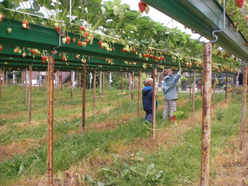 Om alle klanten zo lang mogelijk van onze eigen aardbeien te kunnen voorzien hebben we buiten nu ook een stukje aardbeien gepoot. Op de foto’s is te zien hoe dit in zijn werk gaat. Op metalen palen wordt een smalle lange goot geplaatst waarin de aarbeien worden gepoot. Om te voorkomen dat de planten te nat worden (want dan ontstaan schimmels en gaat de plant rotten) spannen we tijdens de bloeiperiode plastic over de goten. In de winterperiode heeft de plant minder bladeren en is het kouder waardoor het plastic niet nodig is.